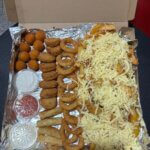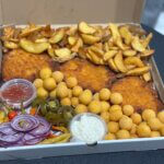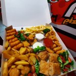 Syrové nugetky, kuracie nugetky, kalamáre, cibuľové krúžky, zeleninové rolky, zemiakové kroketky ( 2 druhy ), hranolky, americké zemiaky, tatárska omáčka, cesnakový dresing, pikantná omáčka, zeleninka