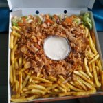 1000g ochutených hranoliek, 500g kebabu ( kuracieho ), cesnakový dresing, zelenina